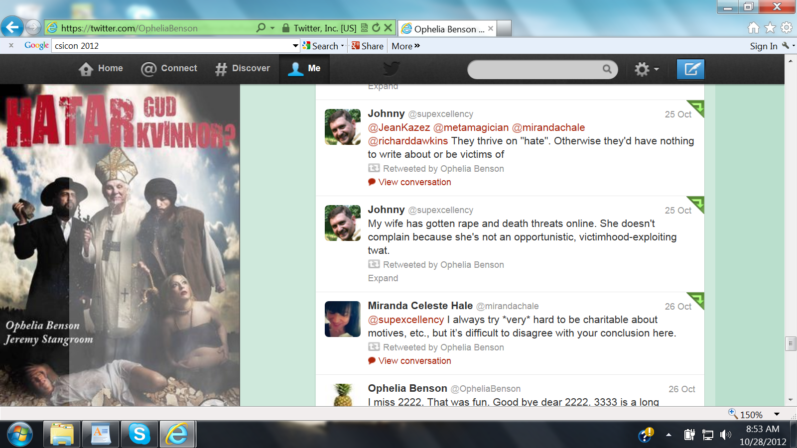 I should also point out that getting rape and death threats from people you perceive as an “Other” is a very different thing from getting them within your own community–Rebecca Watson has said repeatedly that getting rape and death threats from ardent Christians and other theists was just funny, but when they started coming from people in her own community and often with the indulgence of people she thought she could trust, then she felt very isolated and vulnerable. So, you do not get to project your experience onto someone else and think you know exactly what they’re going through. Basic human decency fail.