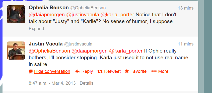 @karla_porter anyway?” Interesting she forgot about this FB conversation from July 2012 – http://www.justinvacula.com/2012/08/ophelia-bensons-continuing-complaining.html …Justin Vacula