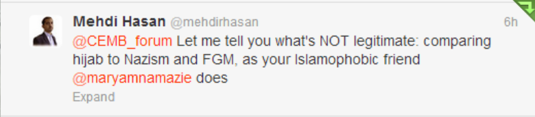 As I said in the last post, Mehdi Hasan calls Maryam “Islamophobic” and claims that she “compares hijab to Nazism.”