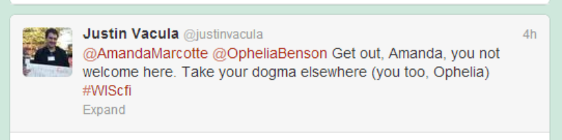 @AmandaMarcotte @OpheliaBenson Get out, Amanda, you not welcome here. Take your dogma elsewhere (you too, Ophelia) #WIScfi