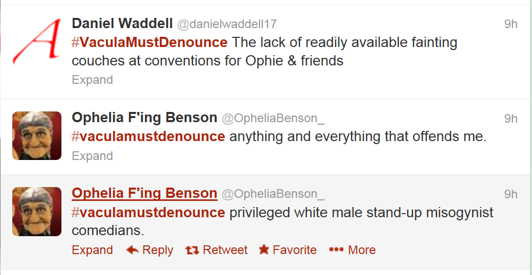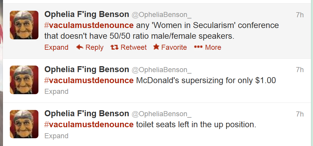 It really is remarkable how much noise these people put out. It’s like a strategy in itself. First, they willfully misrepresent what Dave Silverman was talking about. They take it as an article of faith that he was being asked to denounce things that are inconsequential and unrelated to Vacula (both thoroughly untrue, of course!). Not only does pretending that harassment by atheists, especially at the slymepit, is a minor thing give them cover to keep harassing and gaslight the people being harassed, but this strategy also buries the person under a MOUNTAIN of inanity that, while not explicitly vile in itself, only exists to punish the person for speaking up about their vile treatment, or about ignorant, alienating, and marginalizing treatment from the well-spoken (eg, “it’s more of a guy thing” and “don’t silence the menz”). When the person points out that this is harassing behavior, they claim it’s “just disagreeing” because they’ve devoted SO MUCH TEXT to misrepresenting, obfuscating, and riffing off their obfuscations that observers will likely not even be able to *find* what the disagreement is about, that it has content, and that the values contained in the harasser’s disagreement are reprehensible. Each of these inane, content-free tweets doesn’t seem hurtful in itself, but since each of them are put up in defense of the prerogative to engage in hurtful behavior, they add to the hurt even while the perpetrators can just say “look at how oversensitive these people are, claiming to be harassed over something as innocuous as ‘#vaculamustdenounce toilet seats left in the up position’!”