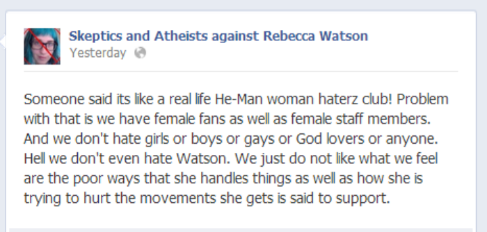 I was going to like the page so I could better keep up on their posts, which are a great opportunity for Socratic trolling. Look at all the knots they’ve twisted themselves into trying to argue that they don’t support sexual harassment and don’t advocate unquestioning loyalty to JREF and have other, totally legit reasons to campaign against Watson, who they don’t hate. That seems like a fast way to get unfriended, though.