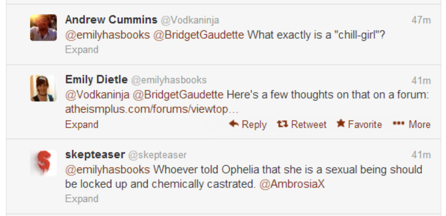 Reading the source Twitter conversation strongly supports Ophelia’s summary of it. Emily’s language is inflamatory and false.