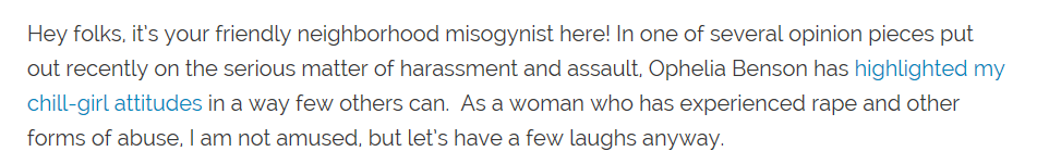 Hey folks, it’s your friendly neighborhood misogynist here! In one of several opinion pieces put out recently on the serious matter of harassment and assault, Ophelia Benson has highlighted my chill-girl attitudes in a way few others can. As a woman who has experienced rape and other forms of abuse, I am not amused, but let’s have a few laughs anyway.