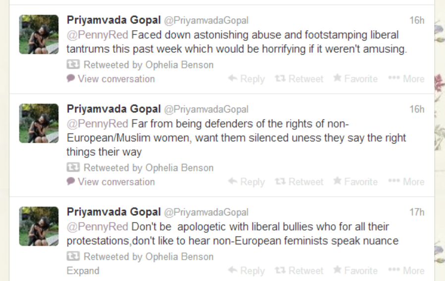 @PennyRed Don’t be apologetic with liberal bullies who for all their protestations,don’t like to hear non-European feminists speak nuance