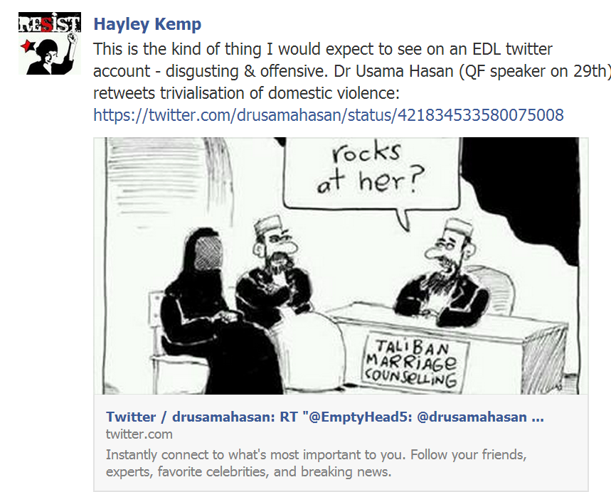 Hayley KempThis is the kind of thing I would expect to see on an EDL twitter account – disgusting & offensive. Dr Usama Hasan (QF speaker on 29th) retweets trivialisation of domestic violence: