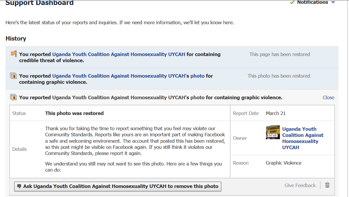 Facebook restored the murderous Uganda Youth Coalition Against Homosexuality page and its murderous photos. It RESTORED them.