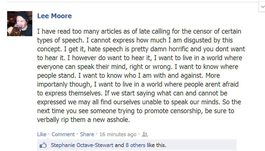 I have read too many articles as of late calling for the censor of certain types of speech. I cannot express how much I am disgusted by this concept. I get it, hate speech is pretty damn horrific and you dont want to hear it. I however do want to hear it, I want to live in a world where everyone can speak their mind, right or wrong. I want to know where people stand. I want to know who I am with and against. More importanly though, I want to live in a world where people arent afraid to express themselves. If we start saying what can and cannot be expressed we may all find ourselves unable to speak our minds. So the next time you see someone trying to promote censorship, be sure to verbally rip them a new asshole.