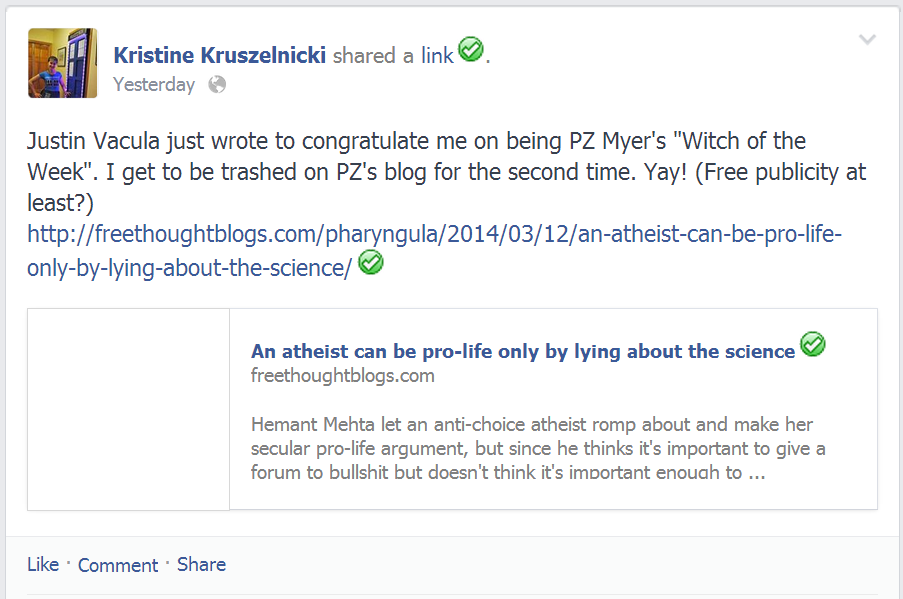 Kristine Kruszelnicki of course is the “secular” anti-abortion rights person who wrote that guest post at Friendly Atheist.