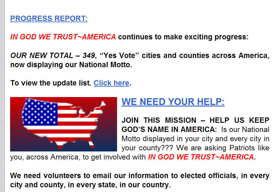JOIN THIS MISSION – HELP US KEEP GOD’S NAME IN AMERICA: Is our National Motto displayed in your city and every city in your county??? We are asking Patriots like you, across America, to get involved with IN GOD WE TRUST~AMERICA.