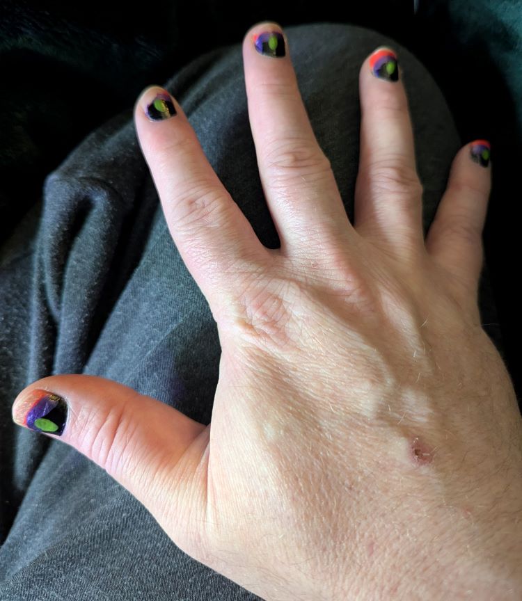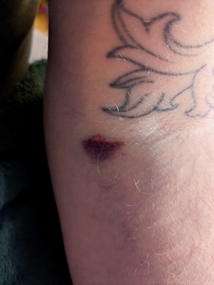 pokey pokes. the more visible stigmata is just a random owie, there’s a lil bro to it where needle went in.