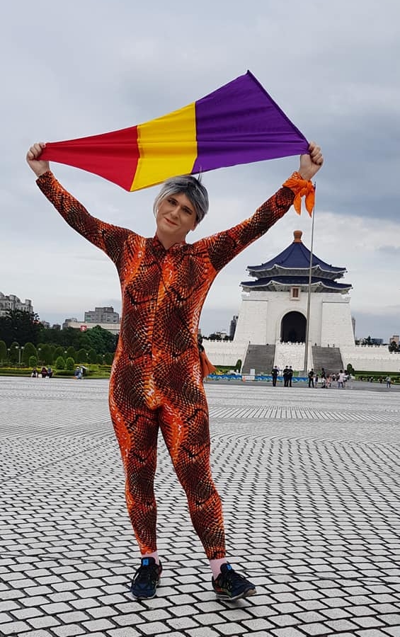 June 2020, at the last minute World Pride event, holding the Intersectional flag I designed.
