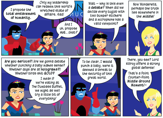 gosh, that first cartoon is harly criticism as recognition of how media paints valid arguments as always being at extreme ends of a long bar. They always disregard a reasonable argument opposed to an unreasonable one as bot extreme viewpoints.