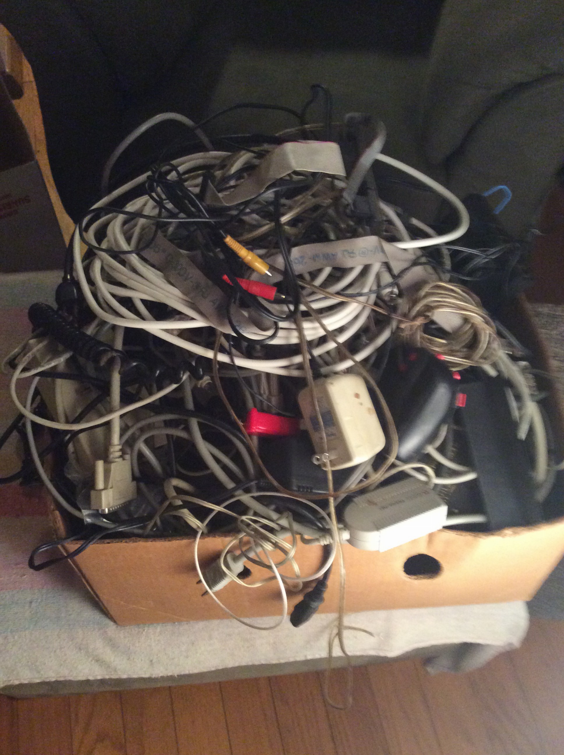 The electronics and associated paraphernalia I’ve thrown out since graduating from college would form a very nice compendium of the state of technology over the last quarter of the 20th century and the first of the 21st. Computers of all types. Modems with acoustic couplers to 56k. Switches. Wireless routers and cable modems. And cables. Oh, my. Cables galore!