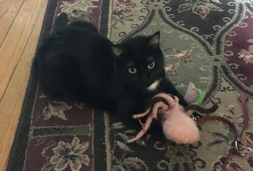 That is basically backwards. The pink thing is teh evil cat, soaked in the gooey remains of the stuffed octopus, which is the black thing once it is turned back to be inside-in (it’s currently inside-out, you can tell because it appears to have binocular vision). Only five or so the stuffed arms are visible — two appear to bave been mostly bitten-off — the remainder are, presumably, either under the remains or fully bitten-off. The pink-covered evil cat, please notice, appears to be on a leash and has about the usual number of cat legs, providing additional evidence of both its evil- and cat-like natures.