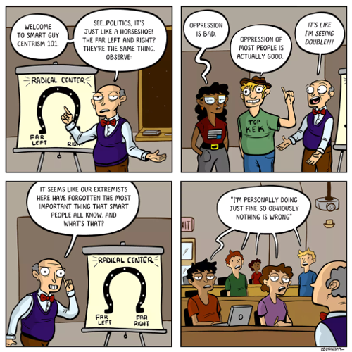 Centrism works ok when there’s nothing important at stake. Splitting the difference between “oppression is good” and “oppression is bad” is not one of those cases, but unfortunately it seems to be the most common example.