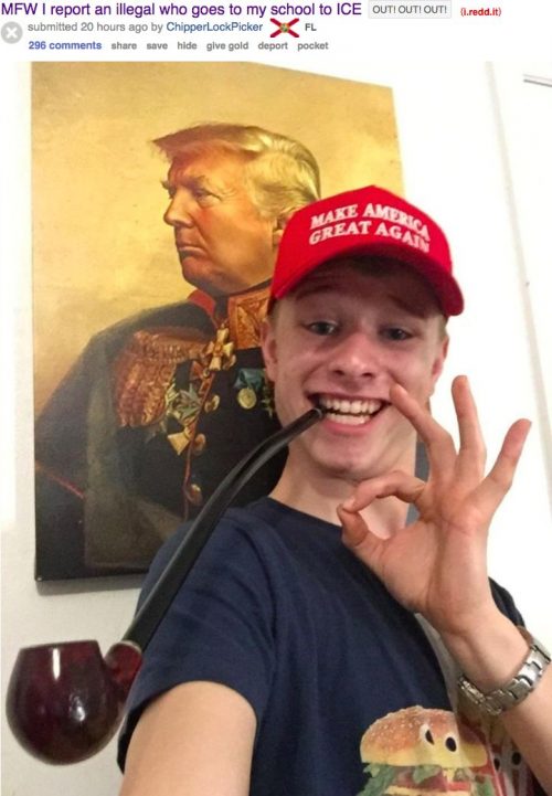 Yeah, he’s proud of reporting a fellow student to ICE, because turning in race traitors is what the Hitler Youth do. He also likes to get on social media and argue that he ought to be allowed to say the “N” word, recite nonsense from The Bell Curve, threaten to murder immigrants, and say “Merry Christmas” as offensively as possible.