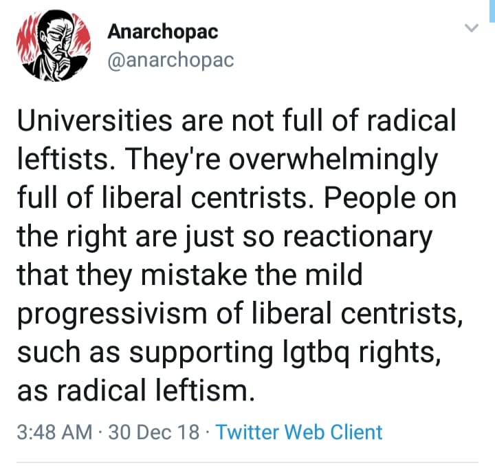 I’ve had people describe me as a far-left radical, which makes me blush…I’m honestly not that far our there. And I know a lot of university people, they tend not to be extremists. This comment is accurate.