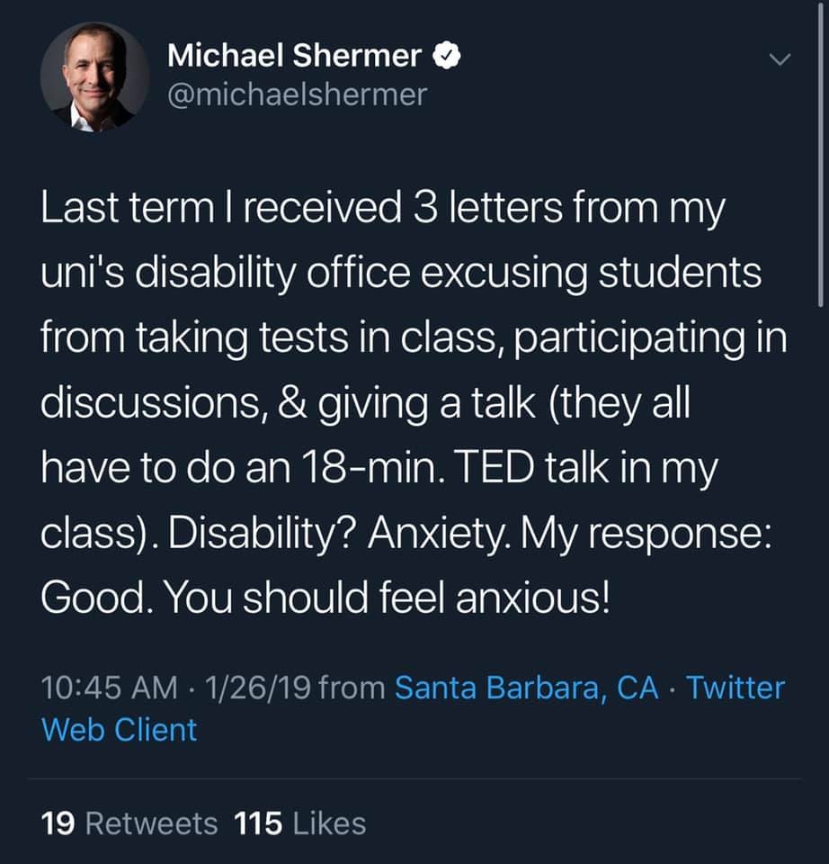 I’ve heard Shermer’s position many times and it makes my blood boil. Your job is to teach your subject to your student, and to do what’s necessary to make that happen. You are not qualified to treat mental health condition x, and even if you were, your students are NOT your patients and you are emphatically NOT authorised to impose your idea of treatment on them during their classes.