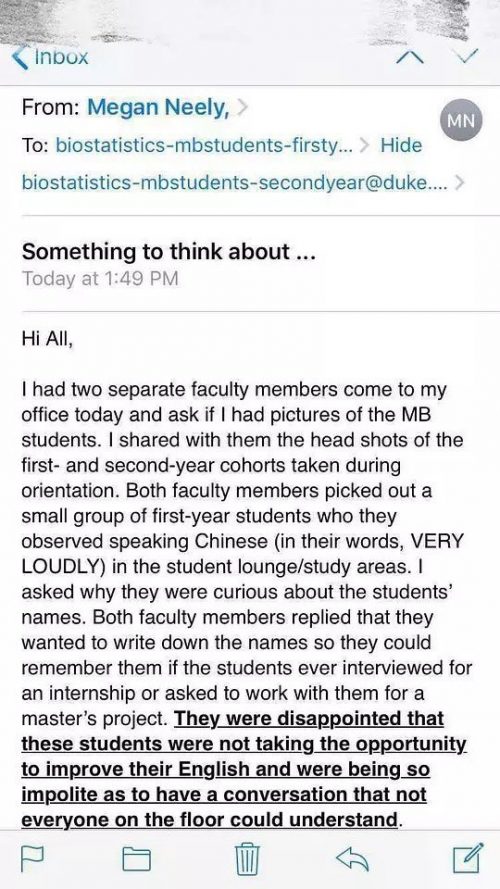 Although it may not be just her fault; that two other faculty members came to her to ask for help identifying wicked students who committed the egregious sin of speaking their native language suggests that there is a widespread problem at Duke University. I have two points to make about this remark: They were disappointed that these students were not taking the opportunity to improve their English and were being so impolite as to have a conversation that not everyone on the floor could understand. The first is that foreign students are going to get better practice in mastering English by listening to faculty in their classes, which are all in English, I ‘m sure, and by communicating with the majority native English-speakers in their community. Why are you seeking to hobble the ability of two fluent Chinese speakers to talk to each other? And second…why the hell do you think you have a right to listen in on the private discussions of students?