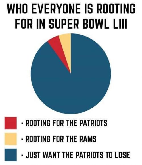 I am a reflexive Pats hater. Even if Rams are in on ill-gotten gains more power to them and good luck against the Maestro. Also I respect the halftime boycott angle in support of Kaepernick. Sharpton, JayZ etc. Can’t say that’s my main reason but it helps me justify not watching. Fuck Jerry Jones and Papa John pizza.