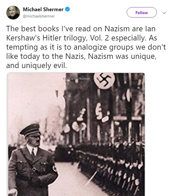 Is that tweet Shermer’s way of apologizing for the way he analogized antifa to Nazis?