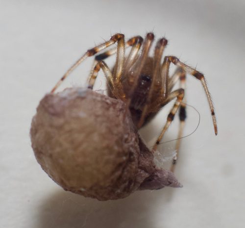 Yesterday, we let Iliana play in a cardboard box. But before we could do that, we had to clear out the spiders that had rapidly colonized it first, and that’s how we caught this nice Parasteatoda. Last night, while we slept, she spun an egg case and laid a lot of eggs in it, and then today, I had to put her in a different container. She would not go. I tried every trick in the book to separate her from her egg case, and she would frantically scurry back up into the vial. Then I tried removing the egg case; no go. She had it tethered, and as soon as I got it away, thwip, she’d reel it back up. I had to give up and let her stay with her eggs. These spiders are extraordinarily maternal.