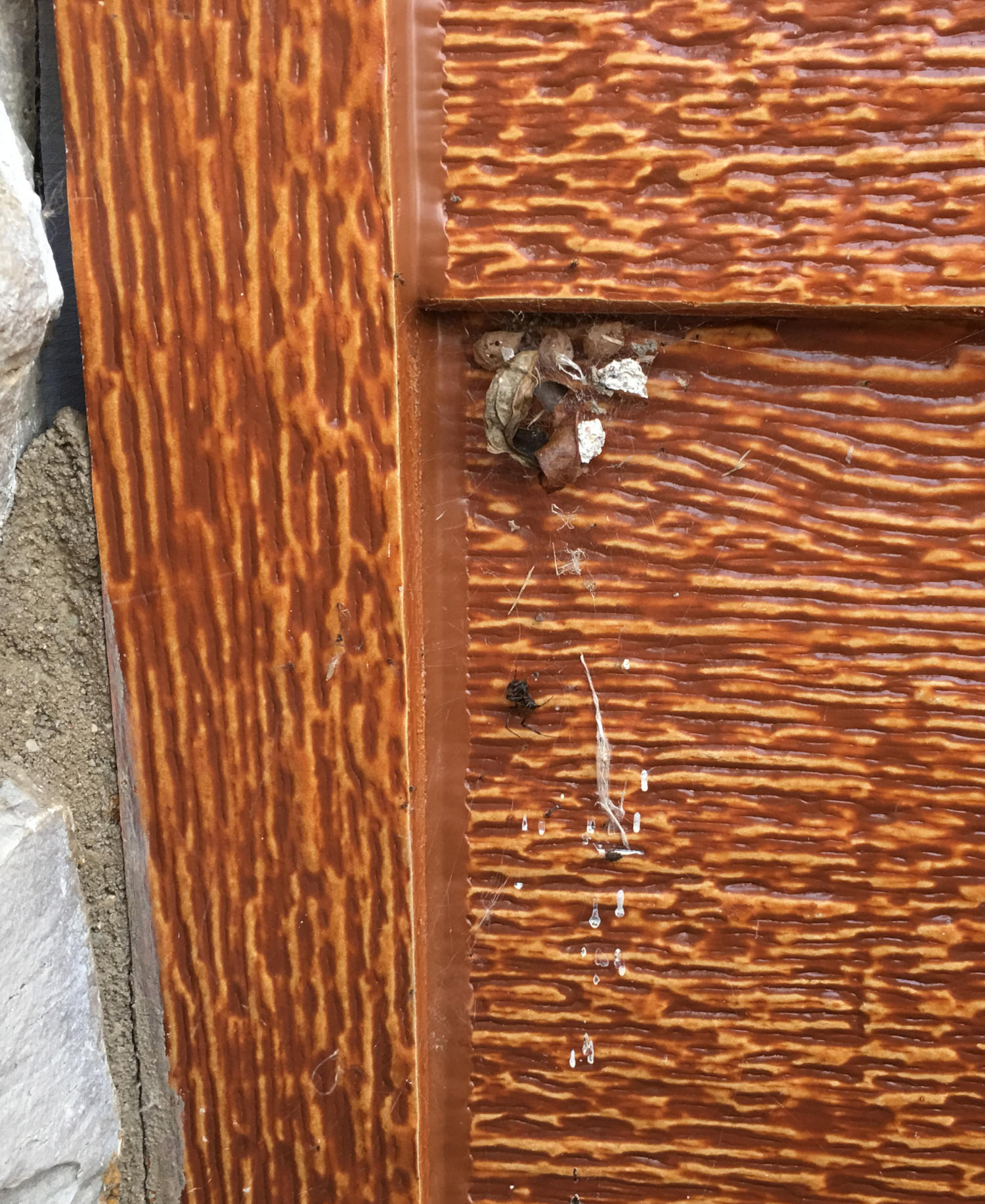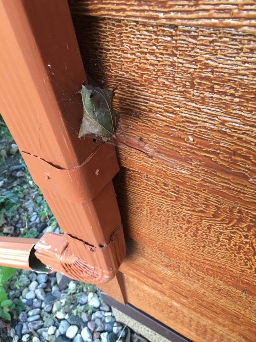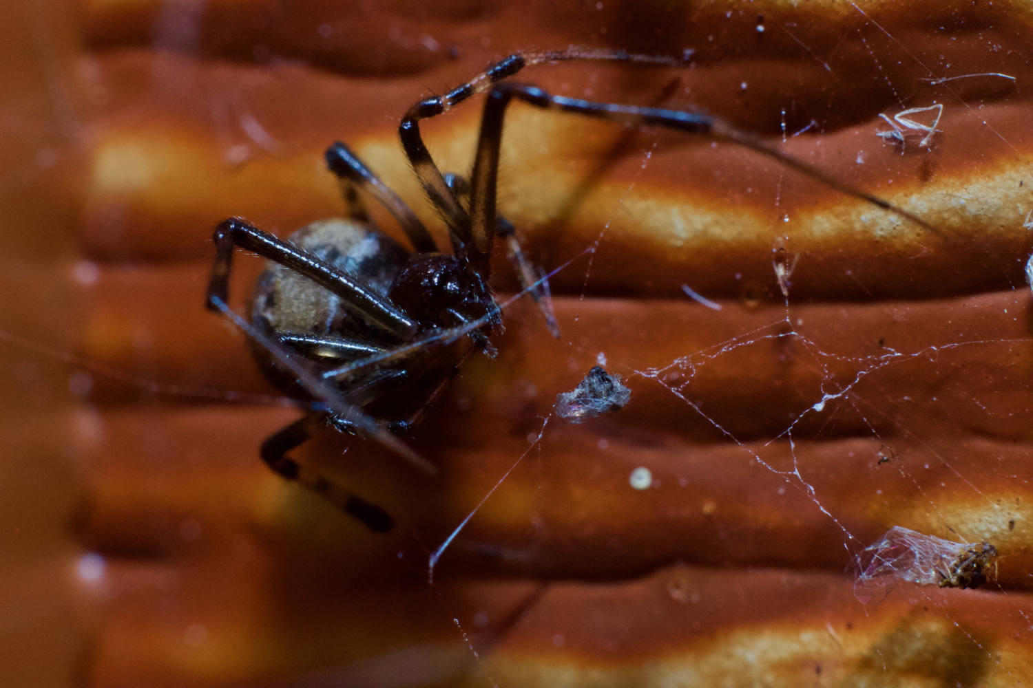 I told you we’re seeing one of the Parasteatoda in the lab is building a fairly dense nest. Today we took a walk around the house and we’re seeing that all the Theridiidae are getting into some intense nest construction. Here’s one example by our front door: