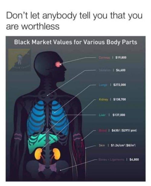 I always hated this (though I see the point in context). It’s very sad to think of your value in terms of parts. The value of being human is to be alive, conscious, and open to experience.