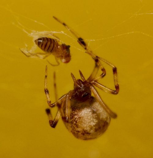 - See if Yara had produced an egg sac. She hadn’t, but there were signs that she was nesting, with some debris pulled up into her favorite corner (which makes me think she might be Parasteatoda tabulata, too.)