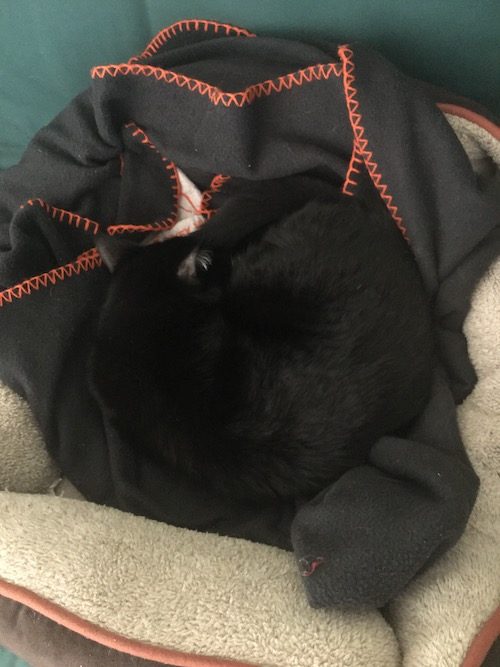 Thursday night my one cat horked up dinner in an unusually wet way, then Friday was not up for breakfast (she’s a morning cat), and only emerged after dark.