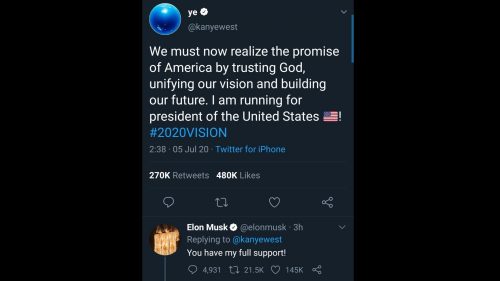 Raven @8 has it right. This is pure publicity stunt, about as serious a run for office as Pat Paulson. We’ll see Kanye on about as many state ballots too (i.e., maybe one or two at most.) He won’t draw any significant number of votes from anyone, but the few he does draw are likely to be the same kind of libertarian “bros” that worship Elon Musk and think themselves quite clever because they’ve managed to justify their selfishness to themselves without resorting to Ayn Rand.