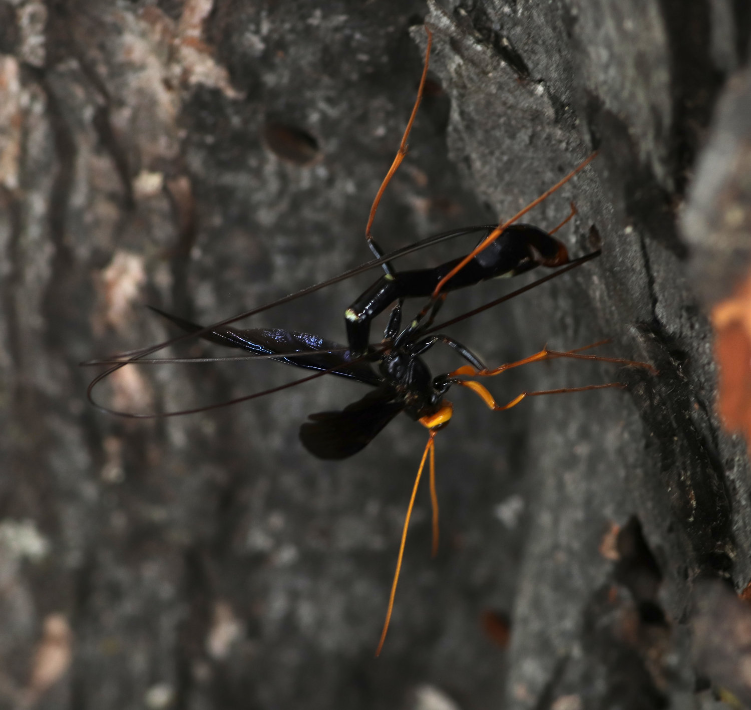 There we were, innocently gamboling about Green River Park, looking for cute and charming little spiders, when I glance at a tree and…what is that shiny yellow&black evil-looking machine over there? It was an ichneumonid wasp with its long glistening ovipositor probing under the bark for plump grubs to parasitize with eggs.