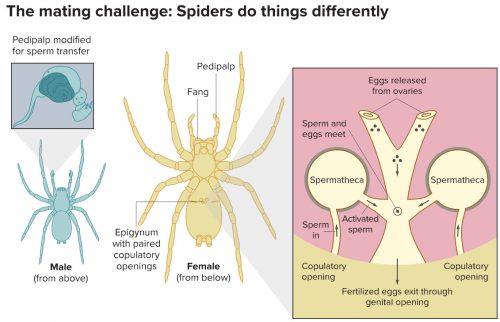 Spider sex is unique even leaving aside extreme size differences. Mature males squirt their sperm onto a tiny “sperm web,” then siphon up the sperm into appendages on the sides of the head for storage until mating. In females, these appendages — called pedipalps — are leg-like structures used to prod and probe prey, but in males the tips are transformed into sperm-delivery organs.