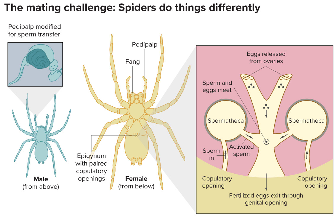 During copulation, the male inserts one palp into an opening in the female’s abdomen, and pumps in sperm. If he gets the chance, he’ll insert his second palp into the female’s other opening. There, his sperm — and that of any subsequent successful male — is stored in pouches called spermathecae until the female begins laying eggs. At that point, the sperm are activated, travel into the egg-laying canal and fertilize the eggs.