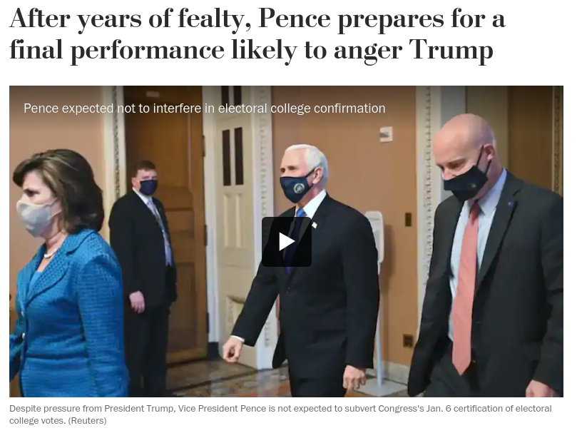 Pence’s performance Wednesday in the Senate chamber will serve as a fitting coda for a vice president who — through a combination of deference, obsequiousness and studied self-effacement — has made navigating the whims and loyalty requirements of his mercurial boss a full-time pursuit.