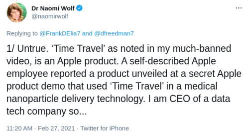 Untrue. ‘Time Travel’ as noted in my much-banned video, is an Apple product. A self-described Apple employee reported a product unveiled at a secret Apple product demo that used ‘Time Travel’ in a medical nanoparticle delivery technology. I am CEO of a data tech company so…