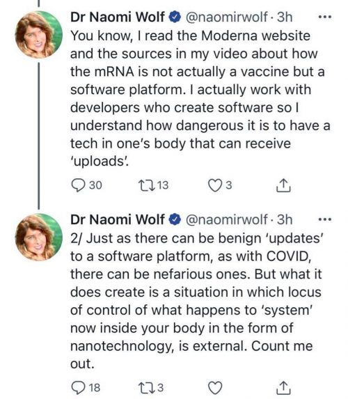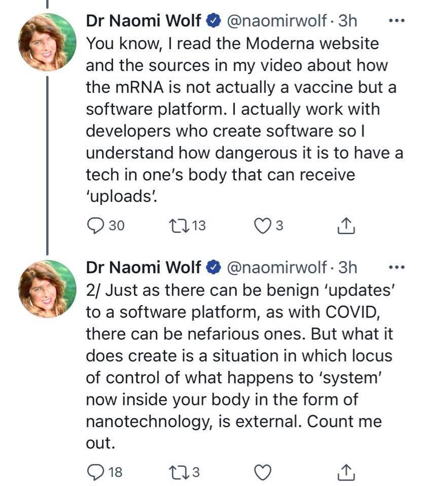 As you should know, Naomi Wolf, former Clinton advisor, is now on the COVID denialism bandwagon. She has gotten worse. Much worse. She has come out with a video denouncing the COVID-19 vaccine as a nanotechnology upload that can be manipulated by developers. Mind control! Tracking! Who knows what nefarious schemes these people are up to.