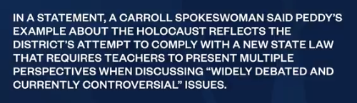 In a statement, a Carroll spokeswoman said Peddy’s example about the Holocaust reflects the district’s attempt to comply with a new state law that requires teachers to present multiple perspectives when discussing “widely debated and currently controversial” issues.