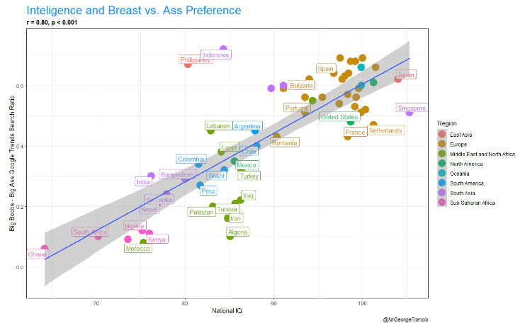 The real danger zone marker here is Mankind Quarterly. Any time you see that journal cited, know that you are going to be exposed to toxic racist bullshit of the worst kind, with the kind of rigor that can be demonstrated with a graph of Intelligence and Breast vs. Ass Preference