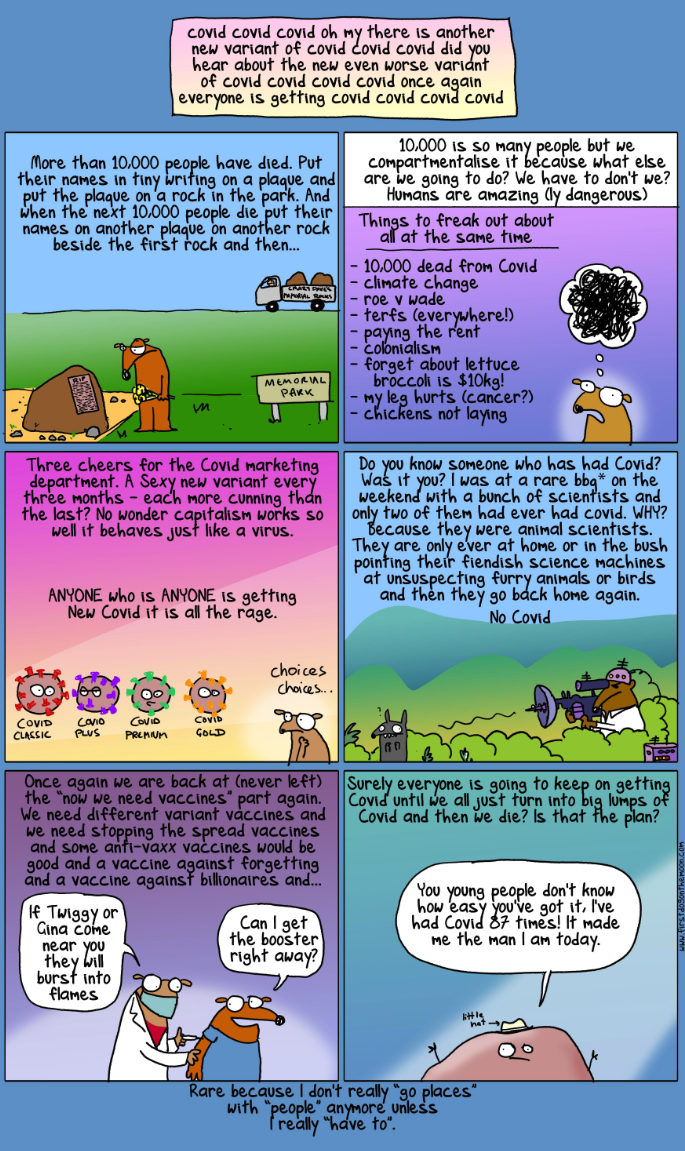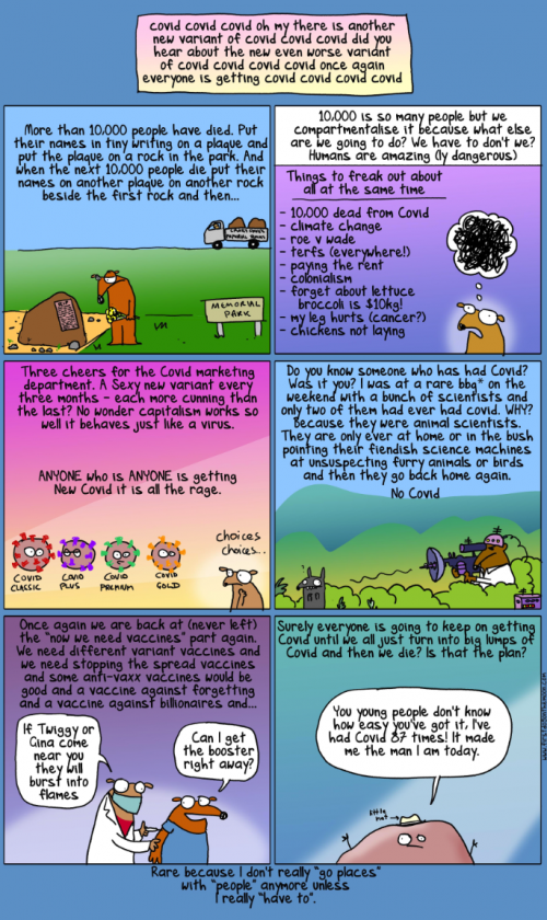 First Dog on the Moon does adequately capture our current sense of the state of the pandemic, although saying “10,000 dead” is so quaint — but then, it’s an Australian comic. American policy has been so consistently stupid that we have over 1,000,000 dead here. Also, I don’t know what a “bbg*” is, someone will have to explain it to me.