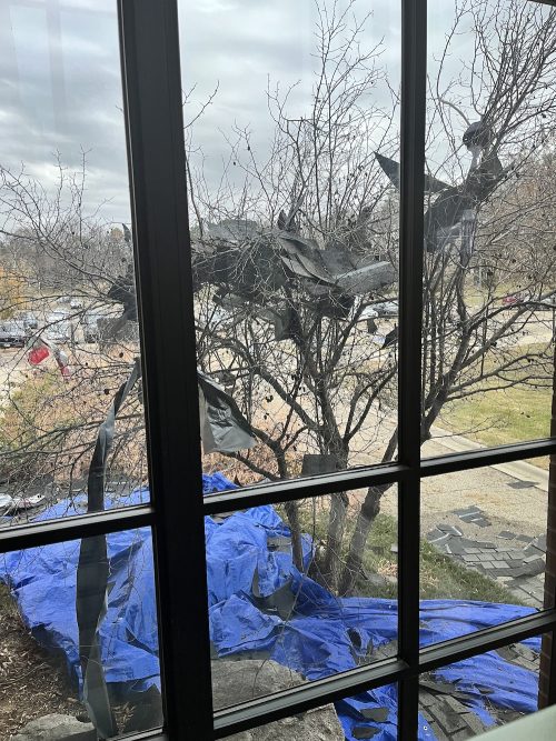 Roofers were working on the science building all last week, hammers pounding all day, and debris being tossed off the roof to the ground below. They inadvertently made a Halloween Tree for us!