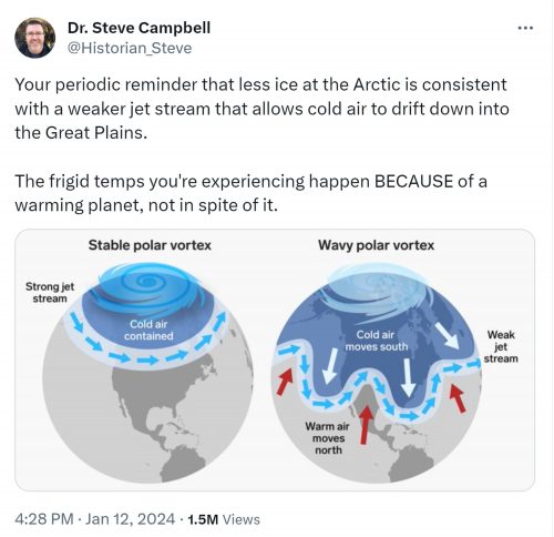 The high was -3C in Utqiagvik, AK on Jan. 15th and the low was -19C, so it seems the warm air has been pushed all the way to the farthest north US weather station. And the sun has not yet risen there this month.