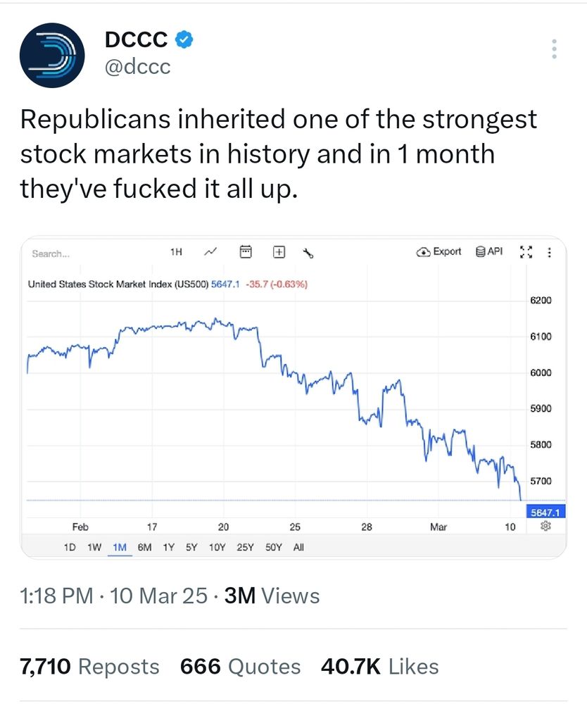 Essentially, what @9 said. The stock market hates uncertainty. Add to this, Trump hates a strong Dollar, and would love to fire Jay Powell. The Fed interest rate decision is this coming Wednesday, so markets will be watching this with quite some apprehension. I don’t think they will cut. The other things to watch this week are Tesla (also Starlink, anything Musk really), and the bank of Japan interest rate decision, which will determine what happens with Yen carry trades. The S&P500 may have entered a correction (down 10%), but I don’t think we’re at the bottom yet.