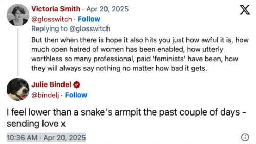 But then when there is hope it also hits you just how awful it is, how much open hatred of women has been enabled, how utterly worthless so many professional, paid ‘feminists’ have been, how they will always say nothing no matter how bad it gets.