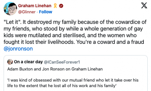 The “it” that destroyed his family is, he thinks, trans people, but really “it” was his pathological obsession with hatred of trans people. Graham Linehan is just a sad pathetic failure of a human being.