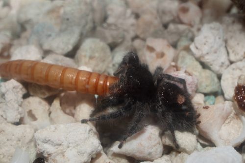 If a mealworm grows up, it turns into a carpet beetle, and is fairly heavily armored so the spiders don’t care for them. Except for the tarantula, who can just crunch them up no problem.