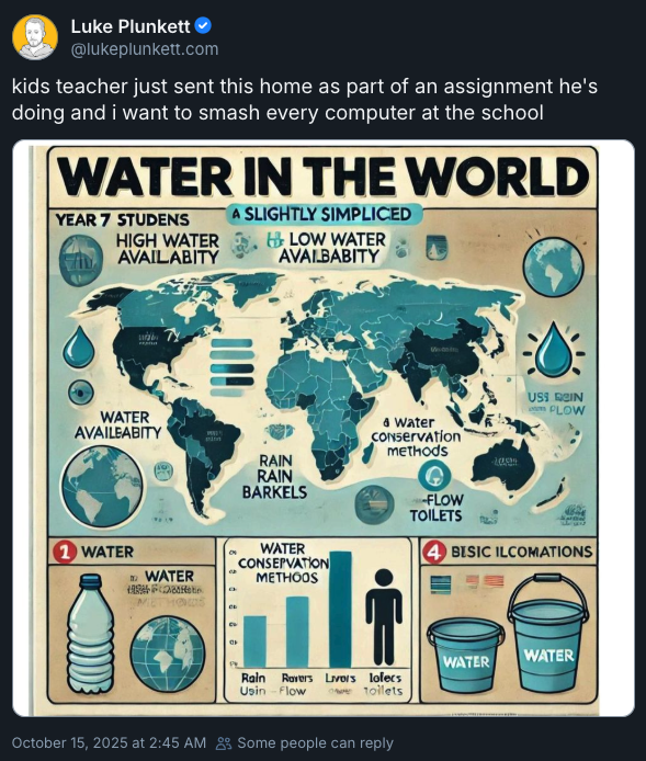 I’m on LinkedIn, and people will frequently post AI-generated drivel as “useful infographics”. I download them and show them to my students for a laugh. If I was looking to hire someone, I’d check their profile to see if they’d posted such nonsense without proofreading it.