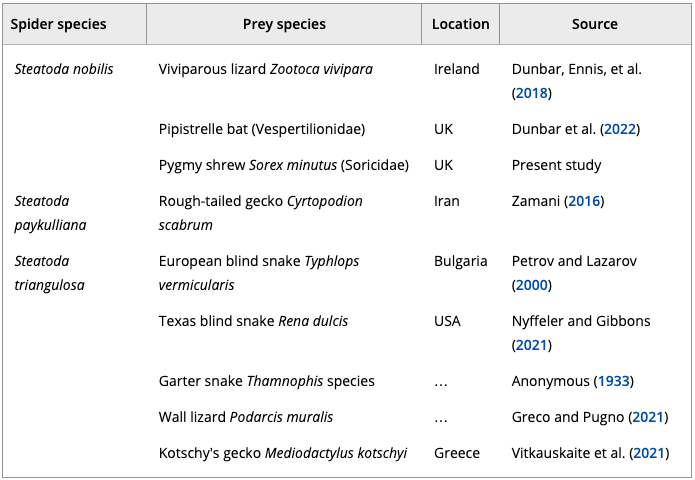 Spiders in the genus Theridiidae (and their cousins, Latrodectus) are well known for hunting and eating prey much bigger than they are, including vertebrates. Here’s a vigorous specimen of Steatoda nobilis trussing up a shrew, which she then reduced to skin and bones over the course of three days.