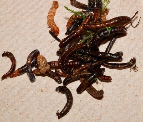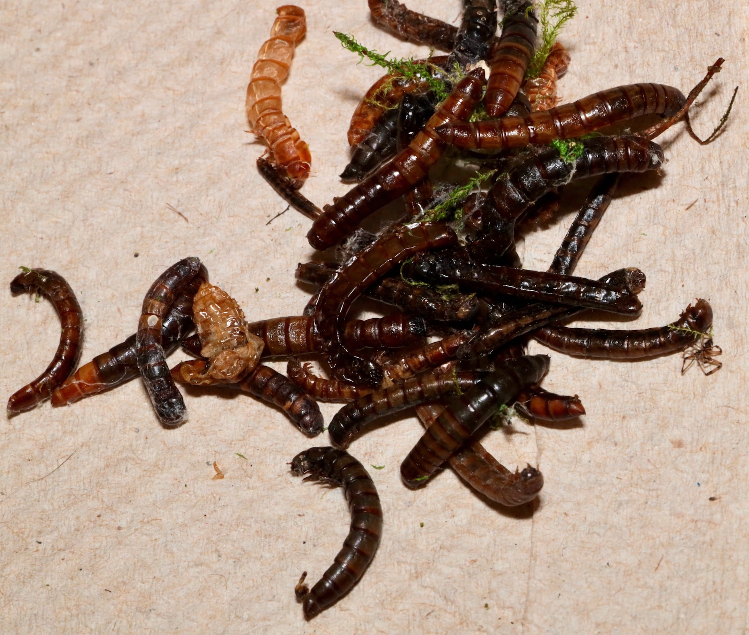 Adults pretty much suck the bodies dry, but these are juveniles I’m feeding, and most of them can’t eat a whole mealworm…but they can kill them just fine, fill their bodies with venom, and slurp out a good meal or two out of them. Then I have to come along and clean up the charnel house. Now I know how a vampire familiar must feel.